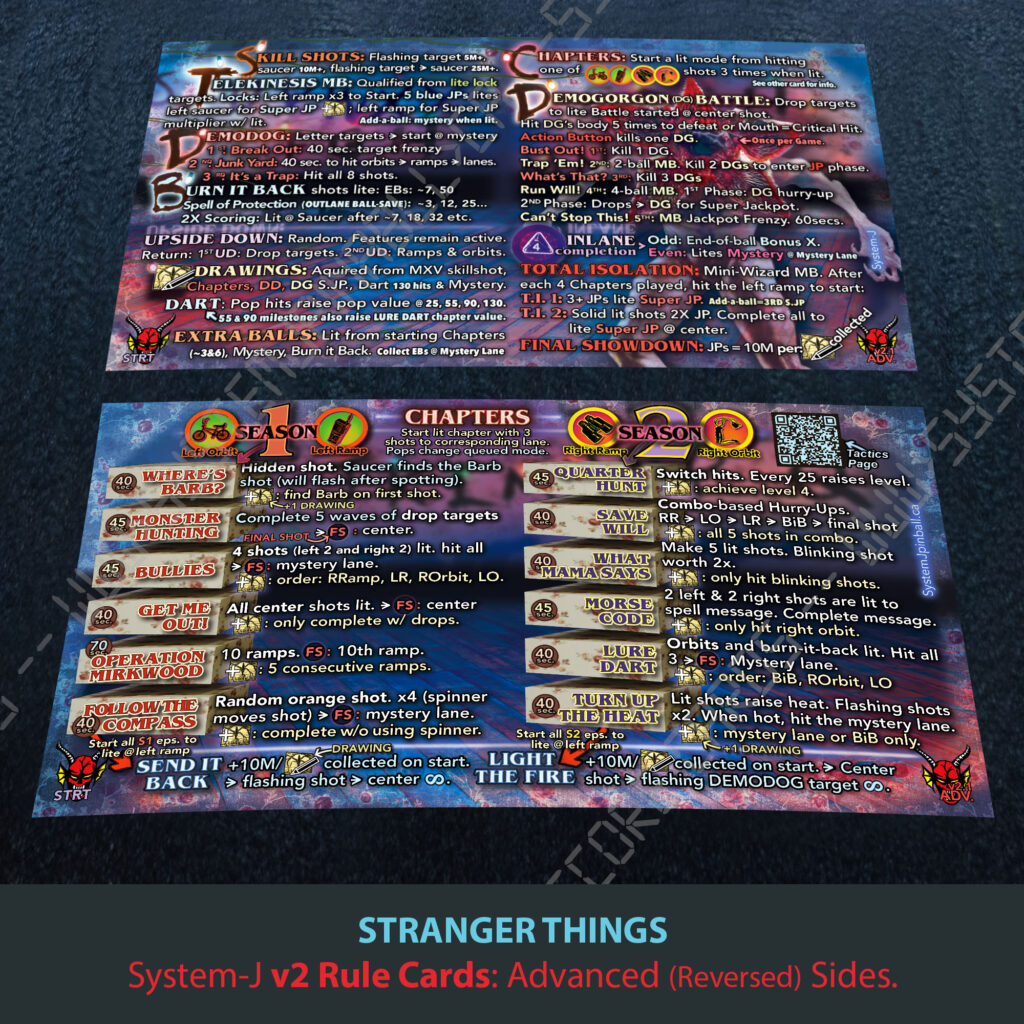 -The advanced side is for players who already know the basics. It has a mix of information and tips on how to reach the certain objectives such as multiball Super Jackpots. The right advanced card tells you about the Chapters, their shots, and how to get more Drawings.