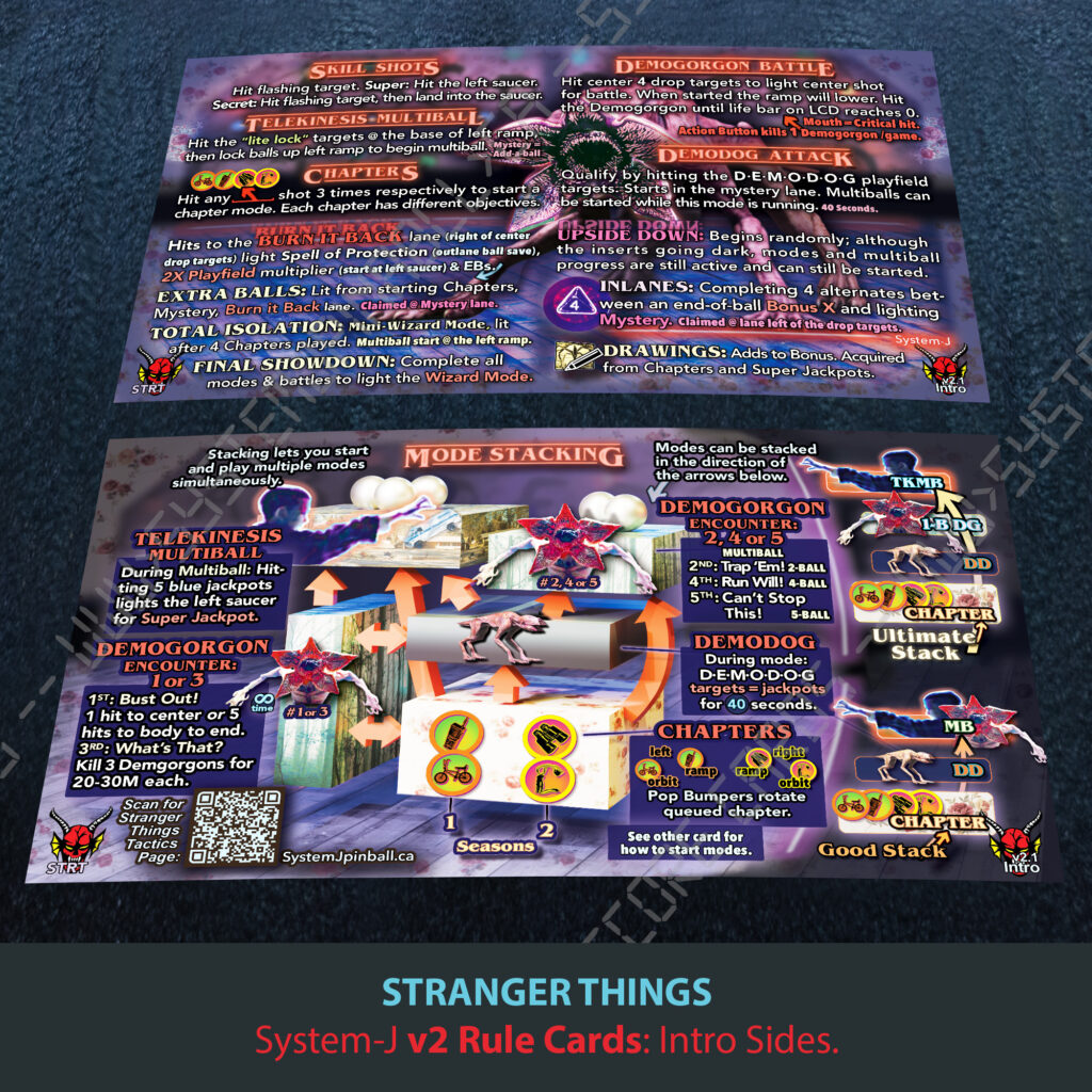 System-J Cards are designed after breaking down the most recent game rules and condensing the most important information. These pinball rule cards (aka. apron, instruction or score cards), then go through many editing steps to improve the text. To ensure that the artwork and colors look right for the game they also go through a lot of professional test prints and are tried out on the corresponding machine. Then, after the final printing I do quality control on each set of cards printed to make sure I don’t send out anything that I wouldn’t be happy with on my own game.